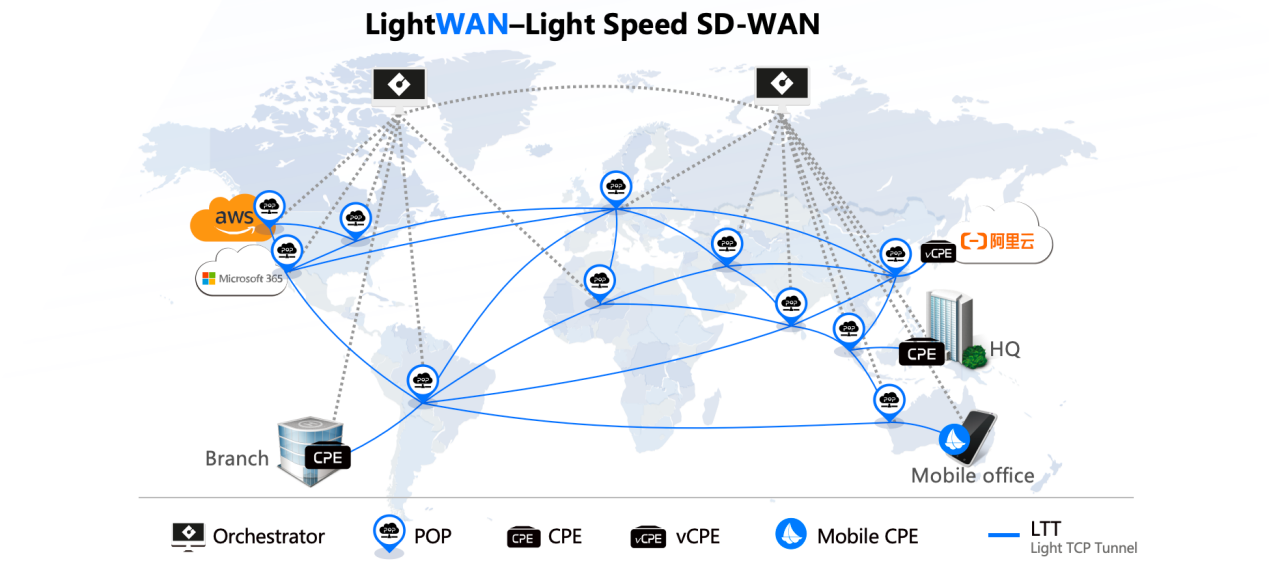 LightWAN企业级通信平台依托其覆盖全球的SD-WAN骨干网为全球企业提供服务。LightWAN 骨干网由超过 600 个 POP节点(数据及业务转接点)组成,按需整合了世界主流运营商和云服务商的优质网络资源,并创造性的将AI应用于网络传输优化以提升网络传输效率。通过分布式的 SD-WAN 控制器(Orchestrator)集中管控并智能调度整网资源,为客户提供高可靠、高质量、无处不在的企业级通信服务。