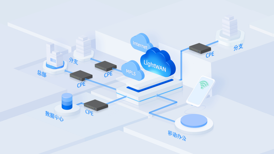 方案内容:在企业总部、分支、数据中心等部署 LightWAN CPE设备,经本地互联网链路就近接入 LightWAN 骨干网,从而实现各办公子网间的互联互通。移动办公用户则可通过LightWAN软件客户端进行接入。