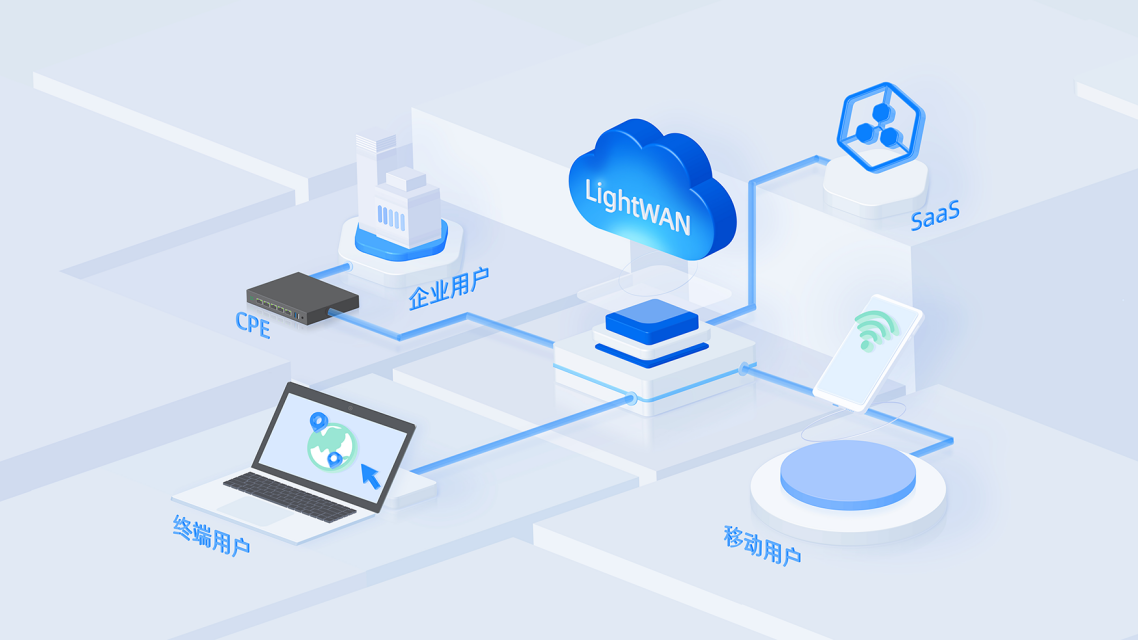 方案内容:在企业用户网络中部署 LightWAN CPE 设备,将用户访问 SaaS 平台的流量接入 LightWAN 骨干网,经路径及传输优化后去往目标SaaS平台。移动办公用户则可使用LightWAN 软件客户端进行SaaS访问优化。