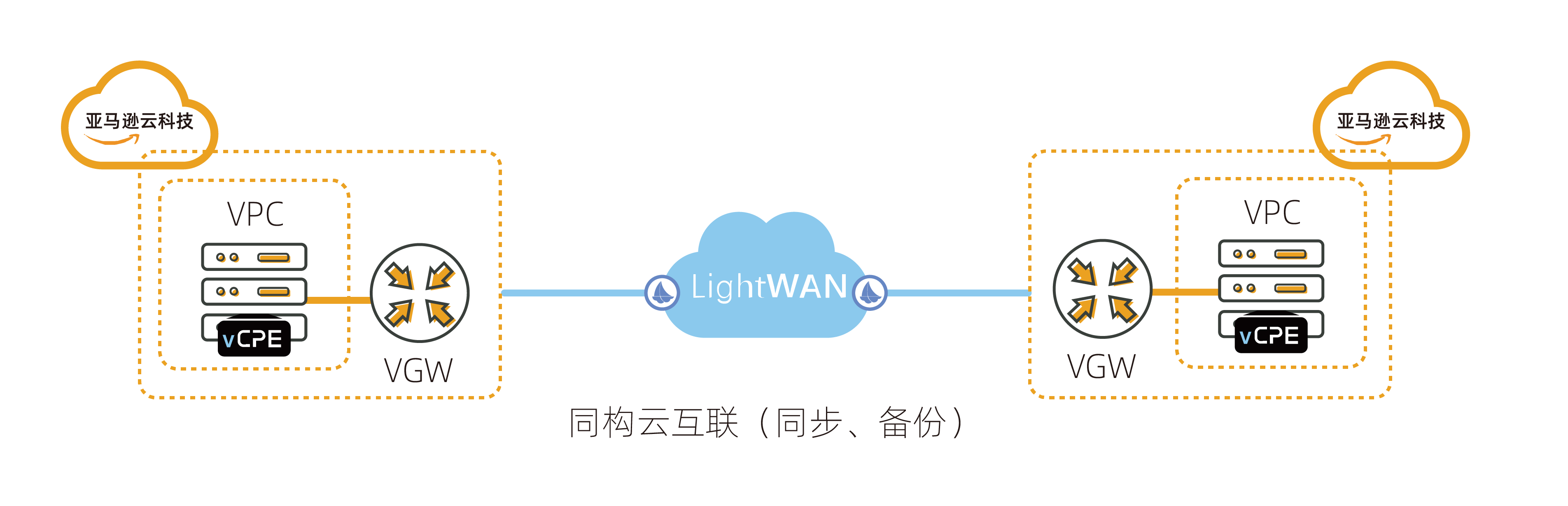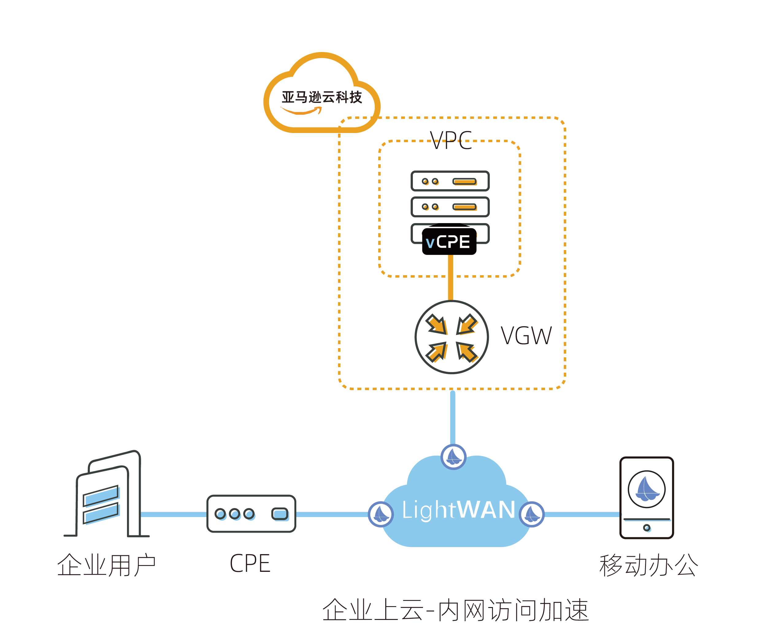 在企业用户网络中部署LightWAN CPE智能网关设备,或采用vCPE虚拟化部署方式(可直接部署在用户提供的虚拟机上);在亚马逊云 VPC中准备一台虚拟主机并安装vCPE系统;对于移动办公的用户可通过安装LightWAN软件客户端以解决访问需求。